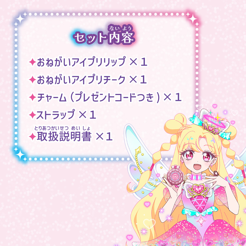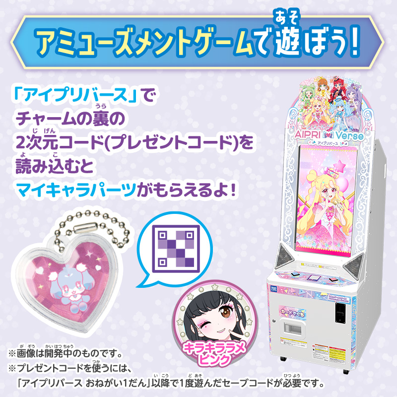 チャームの裏の2次元コード(プレゼントコード)をアミューズメントゲーム「アイプリバース」に読み込むと、マイキャラパーツがもらえます。