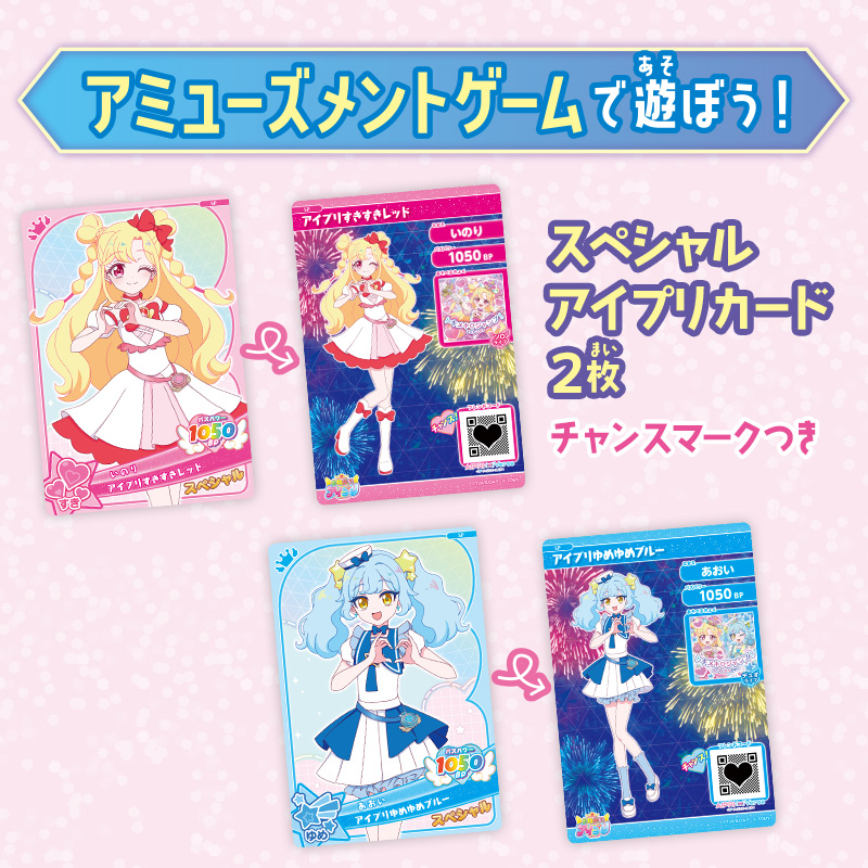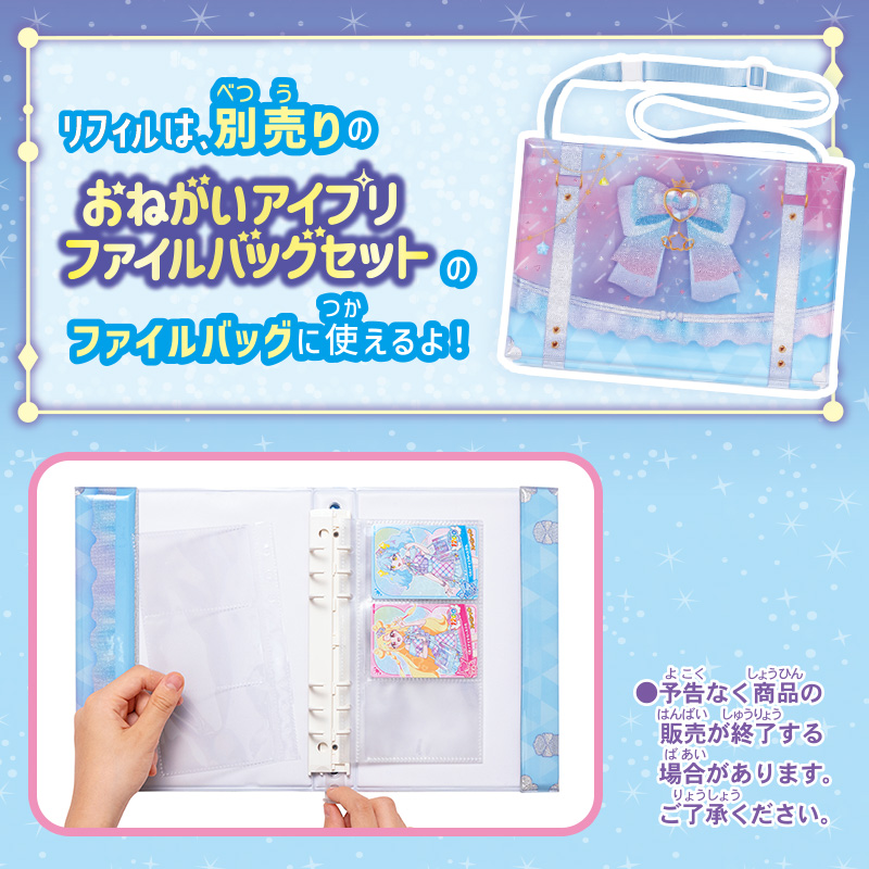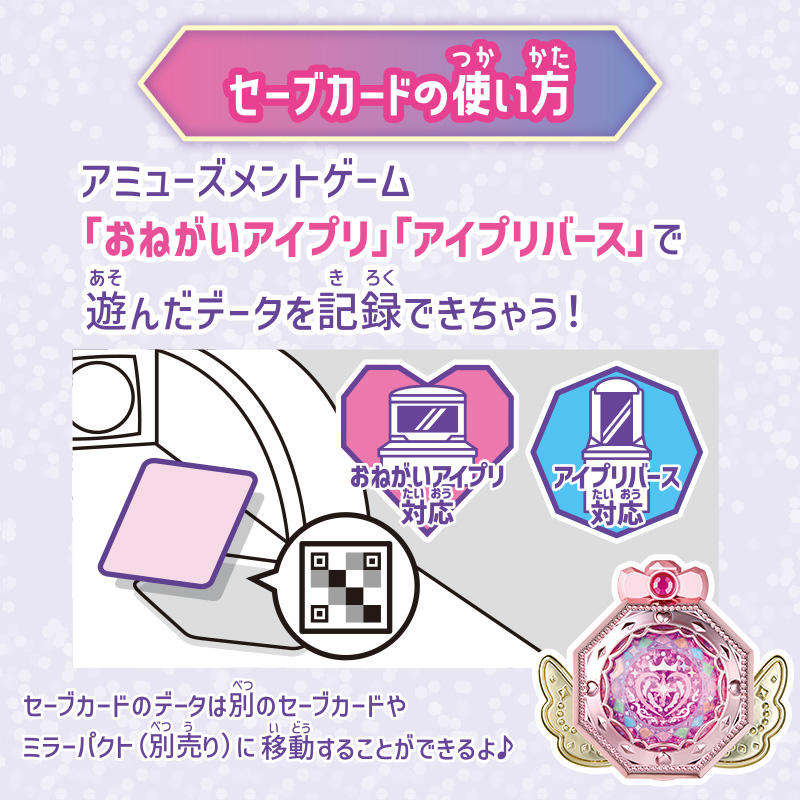 スペシャルなアイプリカード2枚とアミューズメントゲーム「おねがいアイプリ」「アイプリバース」で遊んだデータを記録できるセーブカード1枚、リフィルのセット商品。 アイプリカード2枚とセーブカードは、本商品でしか手に入らないスペシャルデザイン。 セーブカードに記録しているデータは、別売りの「おねがいアイプリ ミラーパクト」などに移動させることができます。 リフィルは、別売りの「おねがいアイプリ ファイルバッグセット」に使えます。