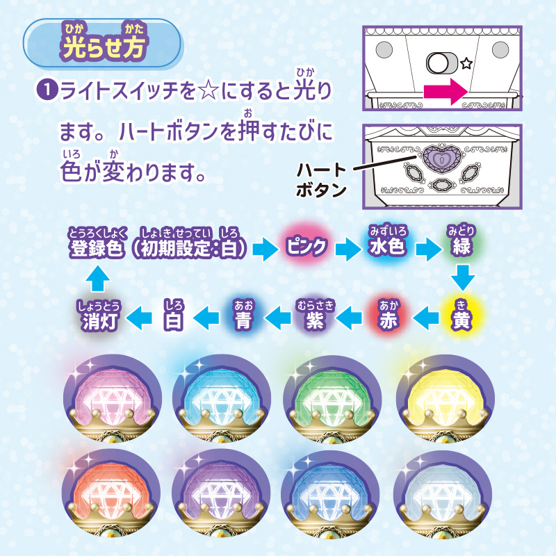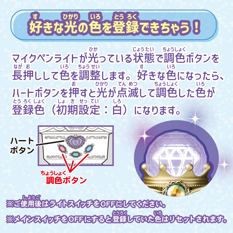 アニメやゲームでアイプリのライブ中に登場するマイクがモチーフのペンライト。 おそろいのマイクで、アイプリになりきることができます。 マイクはカラー8色+オリジナルカラー1色を光らせて楽しむことができます。