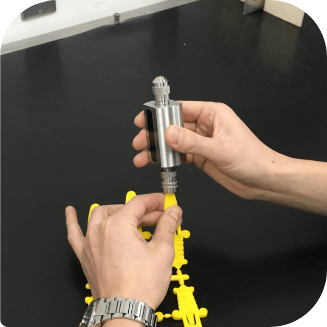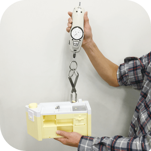 「テンションゲージ」という機器を使って、ひっぱっても壊れないか検査します。