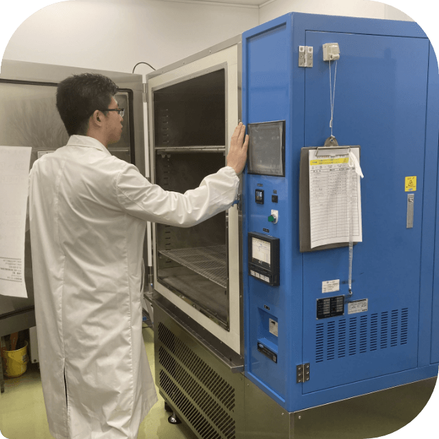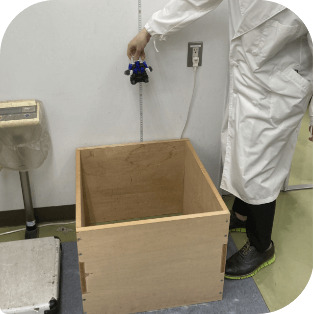 トラックの中など輸送コンテナ内の環境を想定した検査機器の中に商品を入れて異常がないか検査を行います。