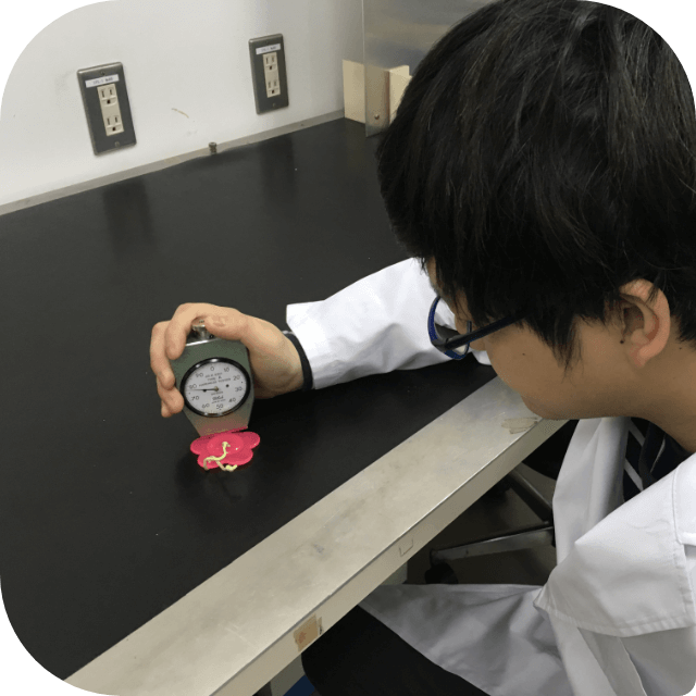 一部のおもちゃの部品では 、ケガをしないように材料の硬さを決めています。硬度計という機器で、硬さを測定する検査です。