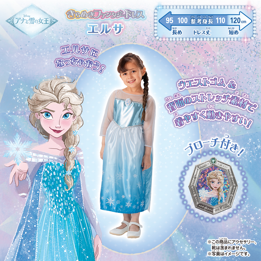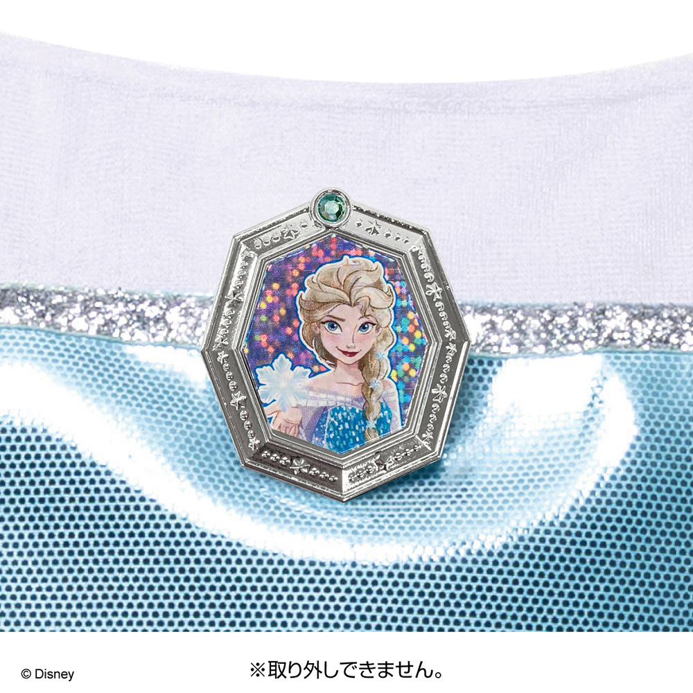 - 胸元にはエルサのイラスト入りのキラキラしたブローチがポイントに!
