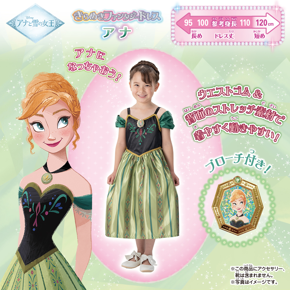 憧れのアナになれちゃうファンタジーな公式ドレスです。キラキラなブローチで気分はプリンセス!