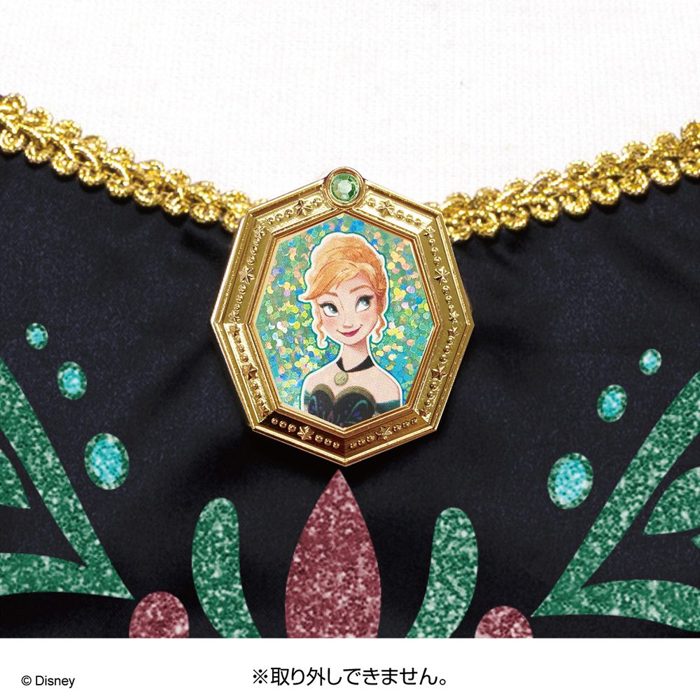 - 胸元はシックな黒にカラフルなプリント、アナのイラスト入りのブローチがポイントに!