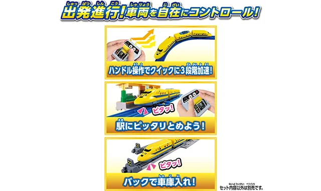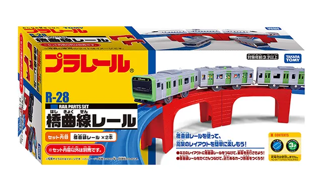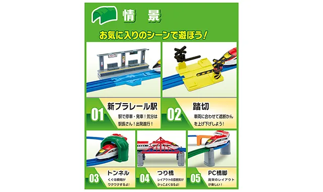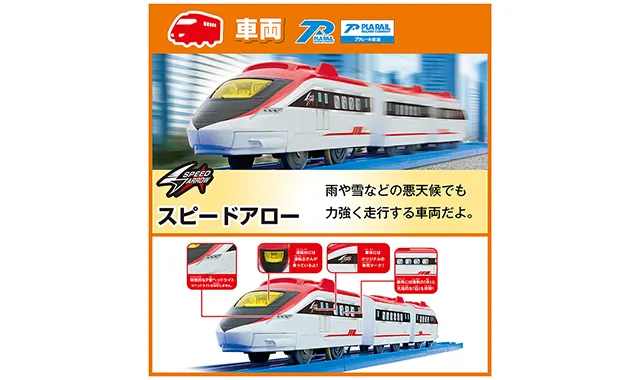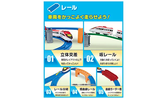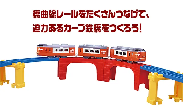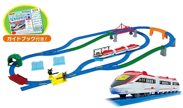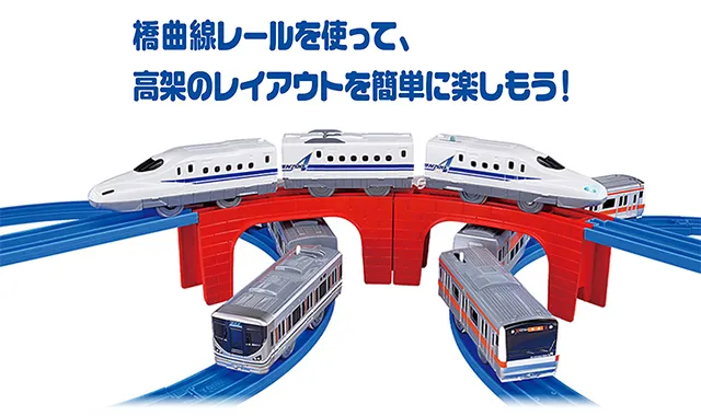 オリジナル新車両「スピードアロー」や、高架が簡単に作れる「橋曲線レール」「PC橋脚」をはじめ、「駅」「踏切」「つり橋」「曲線ガーター橋」「トンネル」まで入った、すぐに遊べるオールインワンセットです。