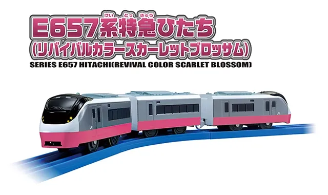 フレッシュひたちリバイバルカラーの特別塗装を施したE657系特急ひたちからリバイバルカラースカーレットブロッサムがプラレールに登場!