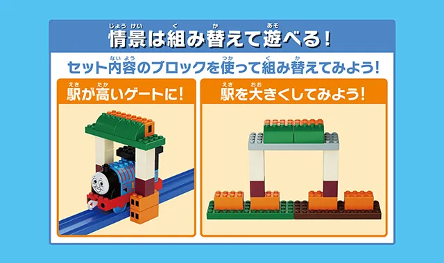 駅(情景)は、セット内容のブロックを使って組み替えて遊ぶことができます。