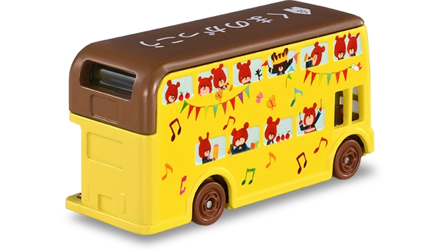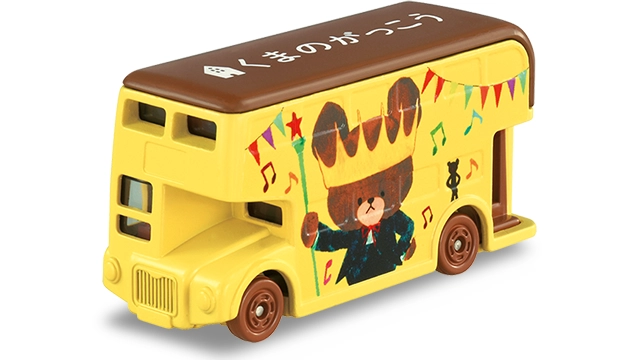 「くまのがっこう」の主人公ジャッキーのラッピングバス。ぬいぐるみのチャッキーも一緒です。