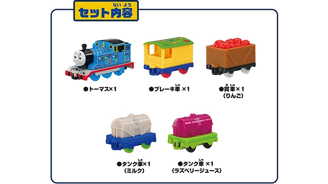 トーマストミカからパーティーカラーのオリジナルデザインのトーマスとかわいい貨車のセットが新登場!セットには下記のなかまたちが入っているよ。
