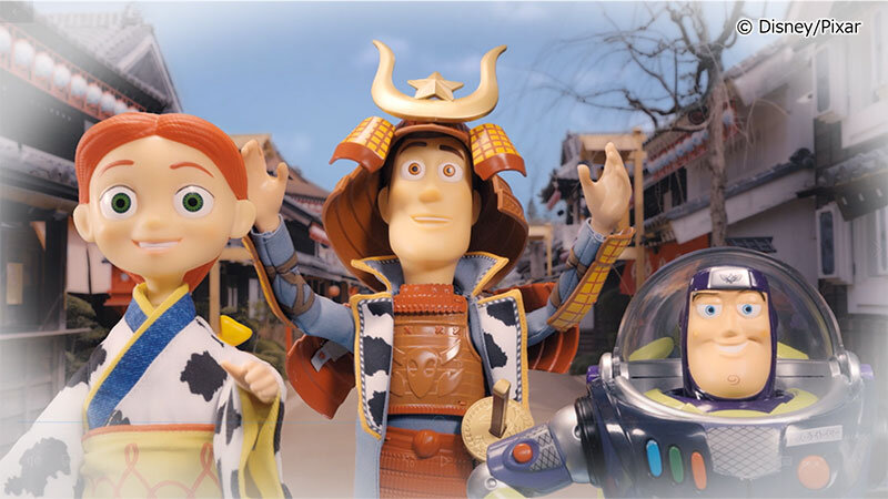 映画でもおなじみのウッディ、バズ・ライトイヤー、ジェシーがそれぞれオリジナルデザインの着物や、忍者、侍(兜)姿で大活躍 する、日本らしさを感じられる、これまでにない作品となっています。