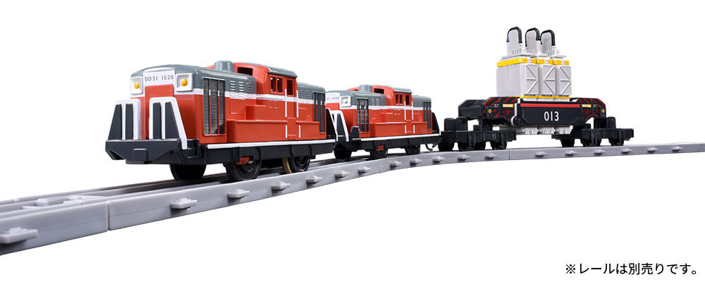 『ヱヴァンゲリヲン新劇場版:序』劇中に登場するDD51形と、「屋外型275kv超高圧通常変圧器」を搭載したシキ880形を3両編成で再現したプラレールです。「プラレール」シリーズで人気の高いDD51形は、深く「鉄道」を楽しみたい方に向けた「PLARAIL」シリーズにおいて初の商品化となります。シキ880形には番号シールが付属しており、ご自由にはりかえができます。クライマックスシーンの想像を膨らませて遊べる要素が詰まった商品です。